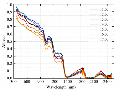 Figure 4 shows the spectrum at 11:00-17:00 on September 15, 2011. The influence factors can be observed to affect primarily the visible region. The reflectance of snow is very high in the visible region, approximately 0.61µm to 0.97 µm, whereas a major decrease is exhibited in the range of 750nm to 2, 500 nm in the near-infrared b and . Particularly near the 1, 350 nm, the reflectance displayed a nearly linear descending trend. In general, the spectral reflectance of the snow initially increased, then decreased. The maximum of the reflectance is 0.93-0.97 at 14:00 and 15:00, whereas the spectral reflectance is minimal at 17:00. The peak value is 0.85, which is mainly attributed to the effect of the solar altitude angle on the reflectance of the snow surface, that is, the reduction of the reflectance of snow is caused by an increase in the solar altitude angle.