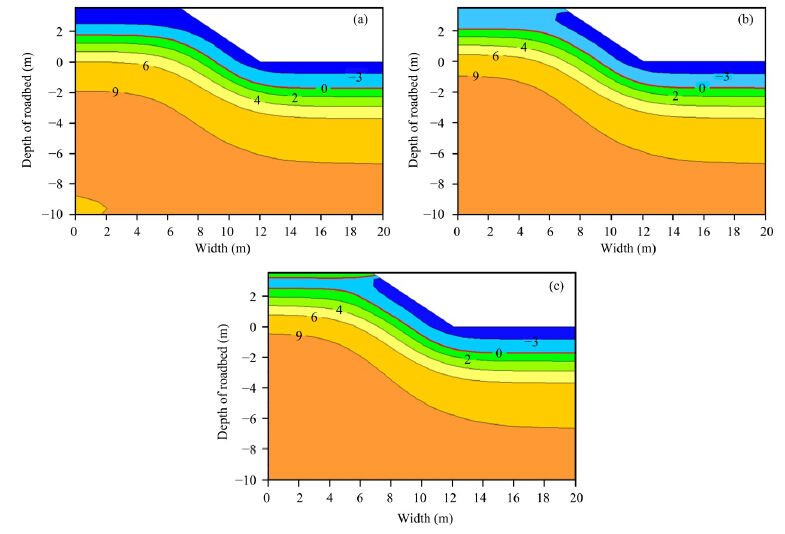 | Figure 6 Isothermal lines of the roadbed on March 10 in the fifth year after completion.(a)cement pavement;(b)black pavement;(c)insulation-black pavement |