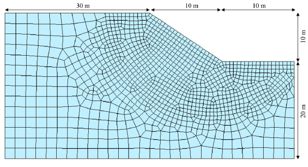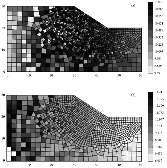 The first slope example, which is composed of 1, 208 elements, has been investigated by Chen et al.(2013), as shown by Figure 2. It is noteworthy that in the present example, the coupled thermal-hydraulic field is not solved so that the strength of frozen soil can't be determined based on the fitted strength parameters, which may depend on temperature and volumetric water(or ice)content(Chen et al.,2013). The soil slope is homogenous except for the cohesion, which follows a normal distribution with the mean as 10 kPa and the COV as 0.3. Hence, the strength variation can be approximately reflected by the normal distribution of cohesion. The Young's modulus E and the Poisson's ratio n are given as 10 MPa and 0.3, respectively. The Mohr-Coulomb soil model with associated plasticity is utilized, and the internal friction angle and the dilation angle are defined as 32° and 32°, respectively. The natural soil weight and saturated soil weight are given as 16 kN/m3 and 18 kN/m3, respectively, and the correlation length along the x and y directions are defined as lcx and lcy, respectively. The effect of correlation length on the r and om field can be observed from Figure 3. It is seen that with an increase of correlation length, the distribution of material property becomes smoother. For the correlation structure, the exponential square model is employed as expressed by Equation .