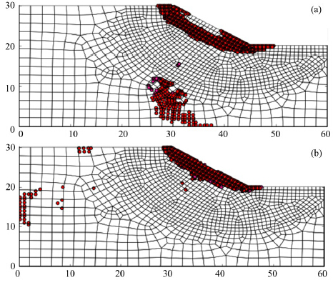 To evaluate the slope, the shear strength reduction finite element method(SSRFEM)is employed and the correlation length lcx = 50 m and lcy = 20 m are applied to generating the r and om field. To accelerate the search process of SSRFEM, the a-algorithm with a taken as 0.2 is utilized to locate the critical(or transition)point between convergence and nonconvergence of the nonlinear Newton-Raphson method. When applying the SSRFEM, the search range for the factor of safety(FOS)is set as [a0, b0] = [0.4, 5.0], and the converged tolerance for the search algorithm of FOS is set as ò= 0.001. To further accelerate the search process of SSRFEM, however, the so-called two-grid search scheme can be used in conjunction with the a-algorithm(Chen et al.,2014a). The Newton-Raphson iteration can be terminated according to the prescribed convergence tolerance tol_nl = 0.01 and the allowable maximum iteration count maxit_nl = 50. For each nonlinear iteration, the symmetric successive over-relaxation preconditioned conjugate gradient(SSOR-PCG)method or the symmetric successive over-relaxation preconditioned symmetric quasi-minimal residual(SSOR-SQMR)method can be adopted(Chen et al.,2006; Chen et al.,2014b). It is noteworthy that in the present slope example, the spatial variability of cohesion of frozen soil is simply simulated with normal distribution, and the effect of thermal-hydraulic field is ignored. In the probabilistic analysis of slope, the Monte-Carlo simulations are performed 100 times and 1, 000 times, respectively, and their cumulative distribution functions(CDF)are plotted in Figure 4. With 100 Monte-Carlo simulations, the calculated mean value and st and ard deviation of FOS are 1.1494 and 0.0088, respectively, while with 1, 000 Monte-Carlo simulations, the calculated mean value and st and ard deviation of FOS are 1.1491 and 0.0055, respectively. Nevertheless, based on the deterministic FEM analysis with constant cohesion(i.e., 10 kPa), the calculated FOS is about 1.7664 which is obviously higher than the probabilistic analysis results, indicating that the probabilistic analysis may provide more information on the slope stability and lead to a more rational design. Hence, based on the 100 Monte-Carlo simulations, it can be concluded that the FOS is 1.1402, 1.1480 and 1.1503 with the confidence of 100%, 79% and 51%, respectively, while based on the 1, 000 Monte-Carlo simulations, the FOS is 1.1402, 1.1480 and 1.1503 with the confidence of 100%, 80% and 51%, respectively. Since the FOS is larger than 1.1402 with the confidence of 100%, we may conclude that the slope will not fail, but the target FOS in the design is 1.1480, we can only say that the slope can meet the design requirement with the confidence of about 80%. The obvious difference in FOS between deterministic analysis and probabilistic analysis may be attributed to the fact that the cohesion of slope may vary in a wide range from 6.052 to 14.211 kPa and slope failure or yielding may occur more easily in those elements with cohesion lower than deterministic value of 10 kPa. As demonstrated by Figure 5 for the distribution of yielding elements, the yielding zone is relatively shallow for the probabilistic analysis compared to the deterministic analysis, since the elements could be weak in strength close to the slope surface as illustrated by Figure 5b. It is noteworthy that there are a few yielding elements distributed scatterly and irregularly, which may contribute to the redistribution of unbalance forces or inaccurate stress integration. However, the existence of these irregularly distributed yielding elements may not obviously affect the observation of slope failure and the accuracy of FOS, and even the scatterly and irregularly distributed yielding elements might be regarded as an indicator that these elements are approaching to the failure stage.